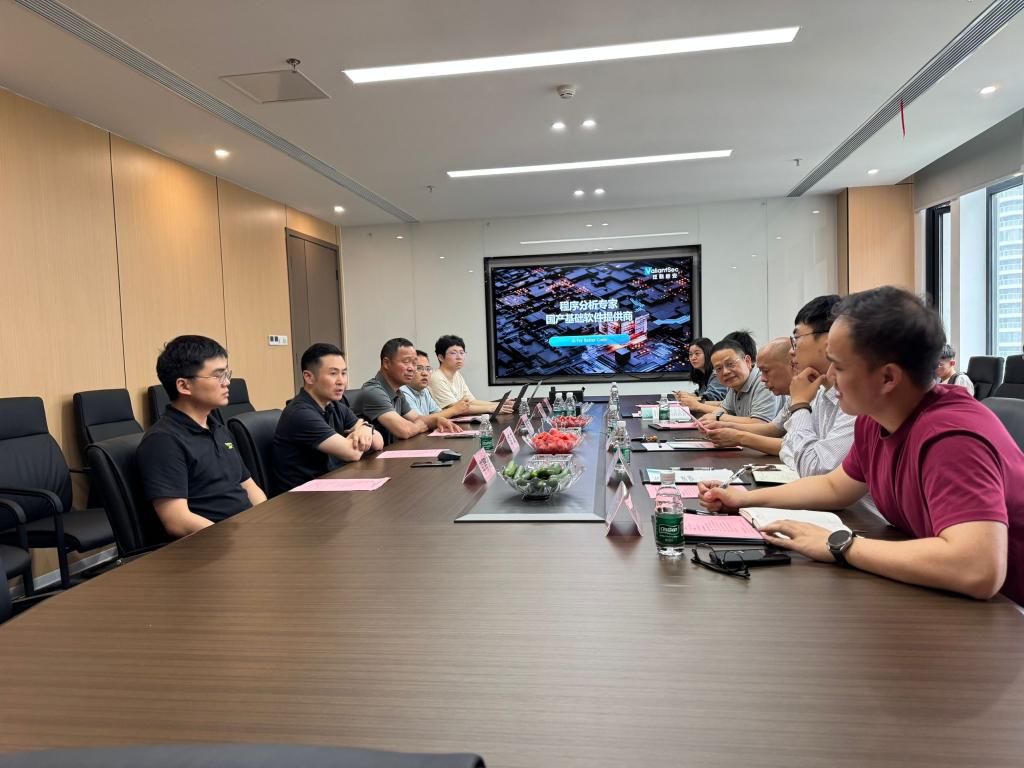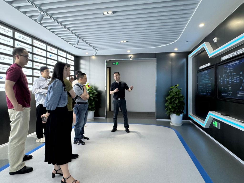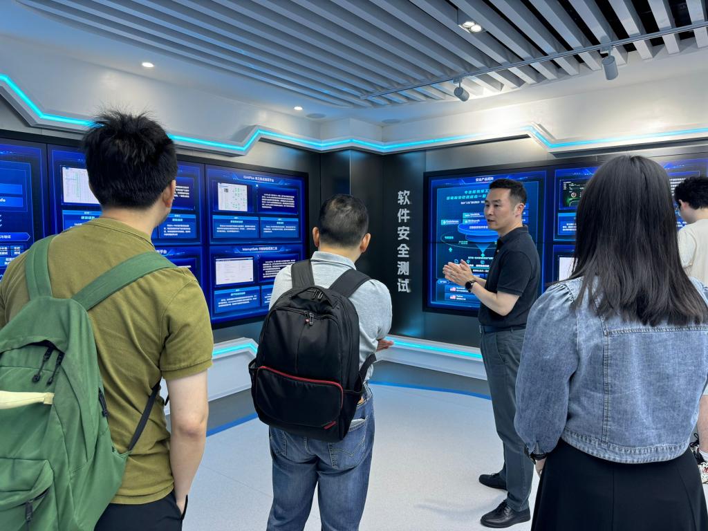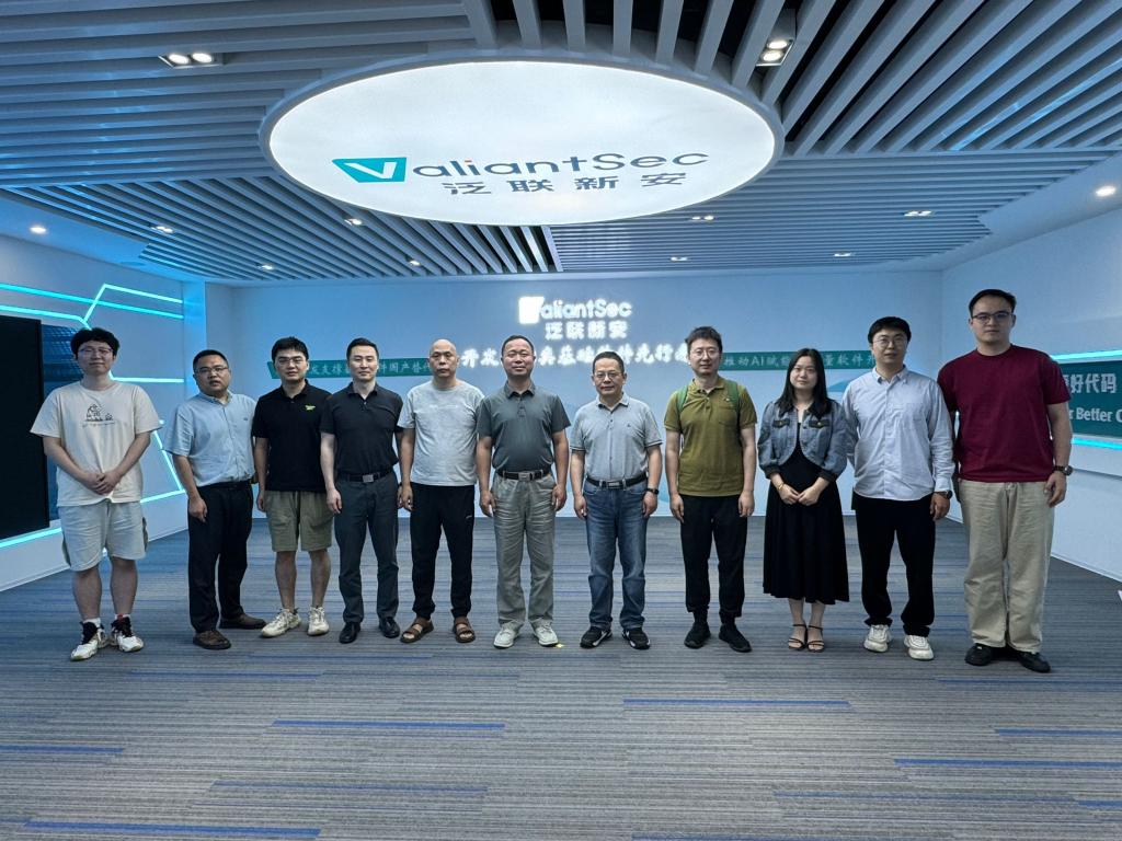 上午10点整,在吴正华部长的引领下,代表团首先参观了泛联新安的办公区,详细了解公司组织架构与业务布局。随后,胡浩与金天宇在公司展厅对泛联新安的公司使命与愿景、核心产品、大模型研发成果及产业应用案例进行了深入讲解,使校方对公司在软件质量测试、软件安全测试与数字IC验证领域的技术优势有了直观认识。