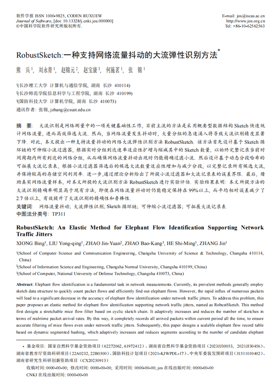 近日,以我院熊兵副教授为第一作者,云顶国际vip8866为第一作者单位的学术论文“RobustSketch:一种支持网络流量抖动的大流弹性识别方法”被软件工程领域的权威期刊《软件学报》录用。《软件学报》致力于介绍计算机科学和计算机软件新理论、新方法和新技术以及学科发展趋势,主要涉及理论计算机科学、算法设计与分析、系统软件与软件工程、数据库技术、计算机网络及其他相关内容的研究。该期刊由中国科学院软件研究所和中国计算机学会联合主办,是CCF A类中文学术期刊。