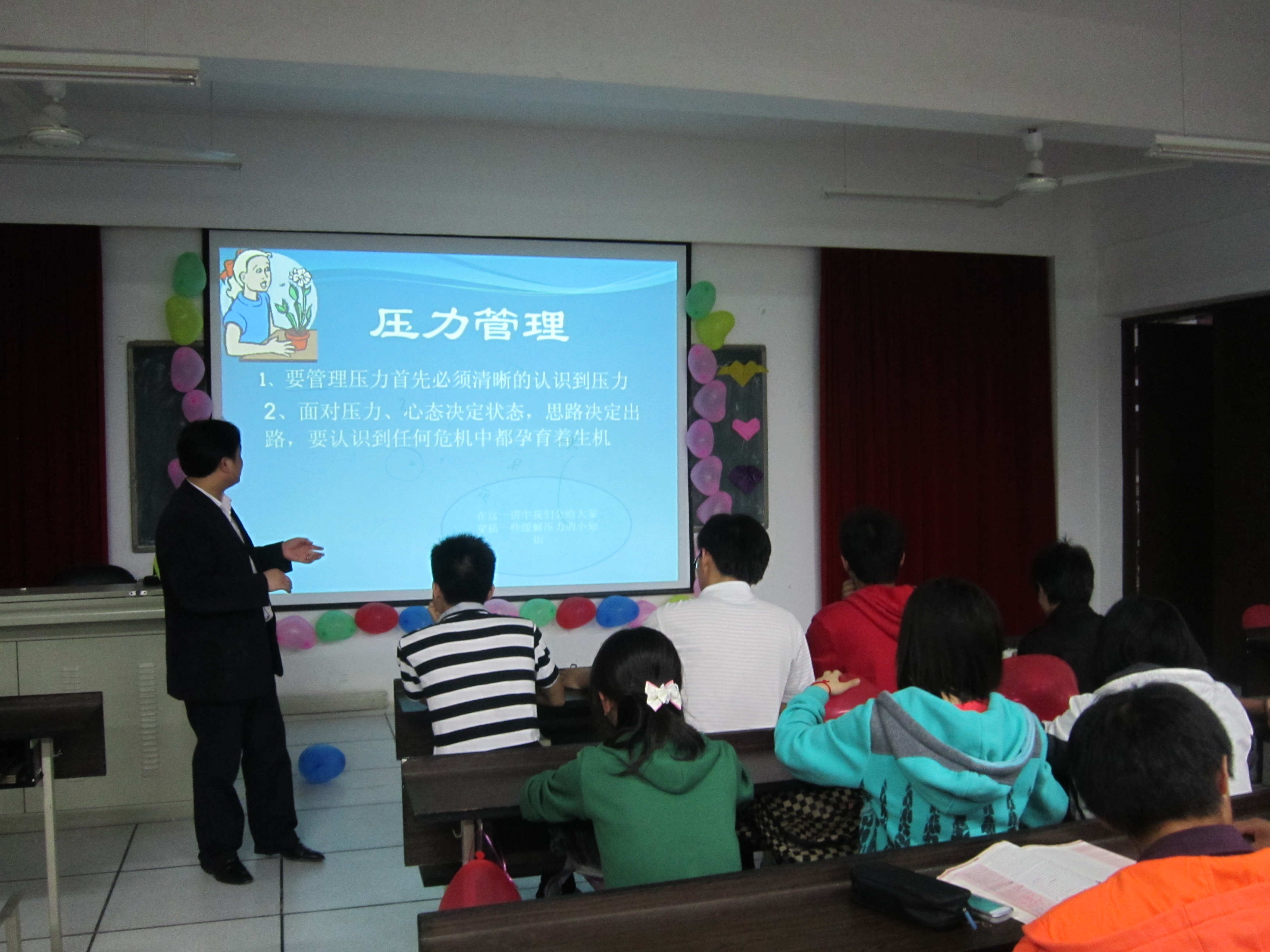 通过这次讲座,同学们强化了心理健康意识,了解了心理压力的产生原因及其严重后果,教会了同学们在以后的生活中如何去缓解压力,避免压力带来的不良后果,对同学们四年的大学生活有着切实的帮助。