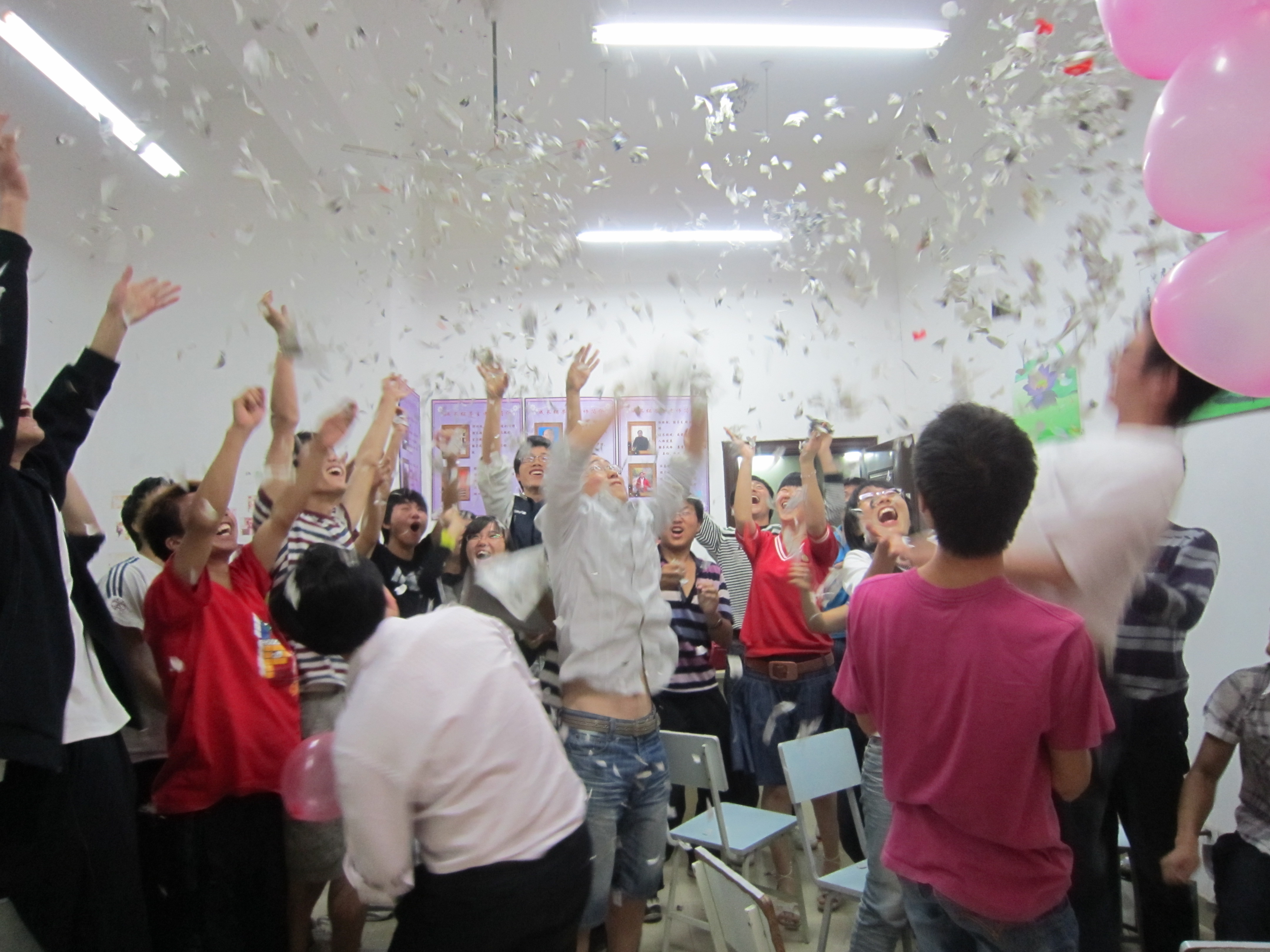 晚上七点整,心理沙龙活动准时拉开序幕。在舒缓的背景音乐下,伍接朝老师向大家介绍了沙龙活动的流程与注意事项,并对大家准时参加心理沙龙活动表示欢迎和感谢。接着,伍老师与唐月来同学一起与大家共同探讨了压力的产生原因及有效的应对方式,并以自己的经历与大家共同分享面对压力的方法,现场氛围活跃不已,笑声不断。在压力释放环节,伍老师把同学们大家分成四个小组,和同学们一起进行了撕报纸和踩气球的压力宣泄游戏,报纸撕得又快又碎,同学们的笑声更是欢快,最后大家还将撕碎的报纸抛向空中,气球也在连续不断的声响中碎了一地,大家玩得既开心又痛快!最后,伍接朝老师给每个参与沙龙活动的同学发放了事先准备好的蛋糕,告诉大家压力就是生活的甜点,关键在于大家面对压力的态度。