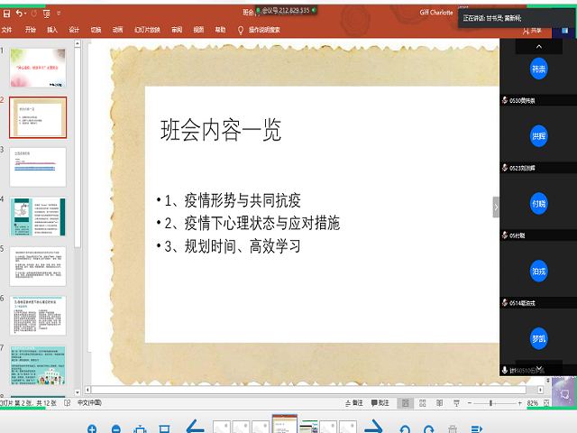本次班会,同学们对疫情防控加深了了解,调适了疫情下的心理状态,规划了返校后的学习、生活,相信人民同心同力,最终一定能战胜疫情!