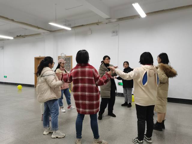 第一个游戏是“盲人旅行”,每个人带上眼罩扮演一个盲人,先独自一人开启旅程,体验盲人的无助、艰辛、甚至恐惧;接着所有学生中一半人继续扮作盲人,另一半人扮演盲人的引路者,由引路者帮助盲人完成室外有障碍的旅行,完成后交换角色重新体验。接着进行了“动作接龙”,同学们不仅需要想出有难度的动作,还需要清楚地记住前面所做过的动作,时而滑稽的动作也让大家忍俊不禁;紧接着是“接球!”游戏,一个人用腿夹住球传给另一个人。规则简单然而操作起来却很有难度,这个游戏需要一定的身体素质,更重要的是需要组员之间的默契以及团队协作能力;最后一个游戏是“阿水”,当成员听到“水”字时,左手抓左边成员的食指,右手逃开。这个游戏需要大家高度集中注意力,竖起耳朵去捕捉“水”字,同时又要兼顾左右手,发挥身体协调能力。