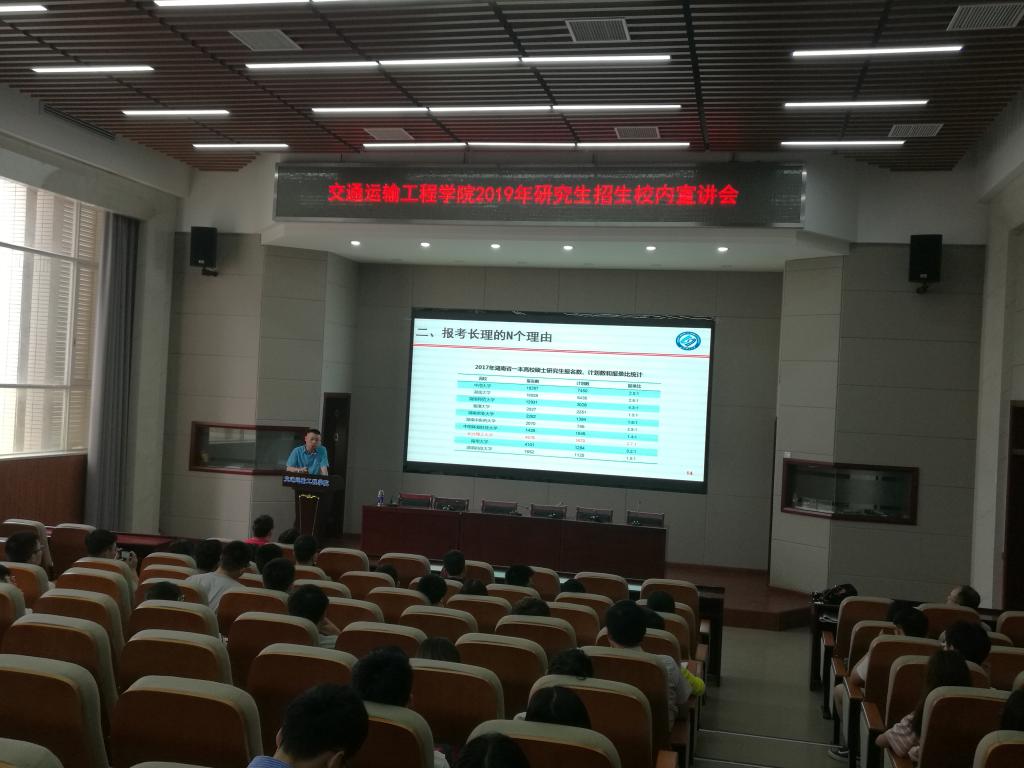 6月12日下午,交通运输工程学院在云塘校区工科二号楼B301召开了2019年研究生招生校内宣讲会,校内近百名学生参加了此次宣讲,宣讲会也吸引了不少外校的学生到场聆听。研究生院龚文斌副院长、交通运输工程学院高英力副院长为学生做了2019年硕士研究生招生宣讲介绍。