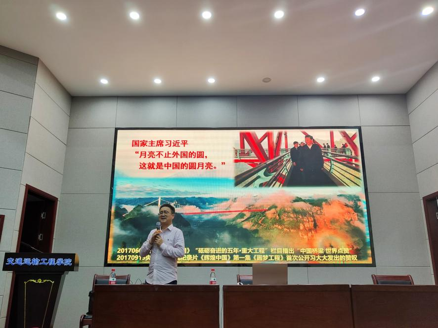 彭立用鲜活的事例、真挚的感情,通过文字、图片等方式,讲述了自己参与矮寨大桥、雅西高速双螺旋隧道等超级工程的所见、所闻、所感,并巧妙结合道路工程知识,从自身研究专业的领域出发进行演讲,引发全场学生共鸣。紧接着,他围绕设计要点、工程规模、施工难度三个方面,介绍了凤凰古城的城际磁悬浮铁路工程。最后,他与同学们分享了三个工程上的故事,以此激励交通学子永远行走在学习路上,在科研这条路上不断探索,翻越一座座科研山丘。