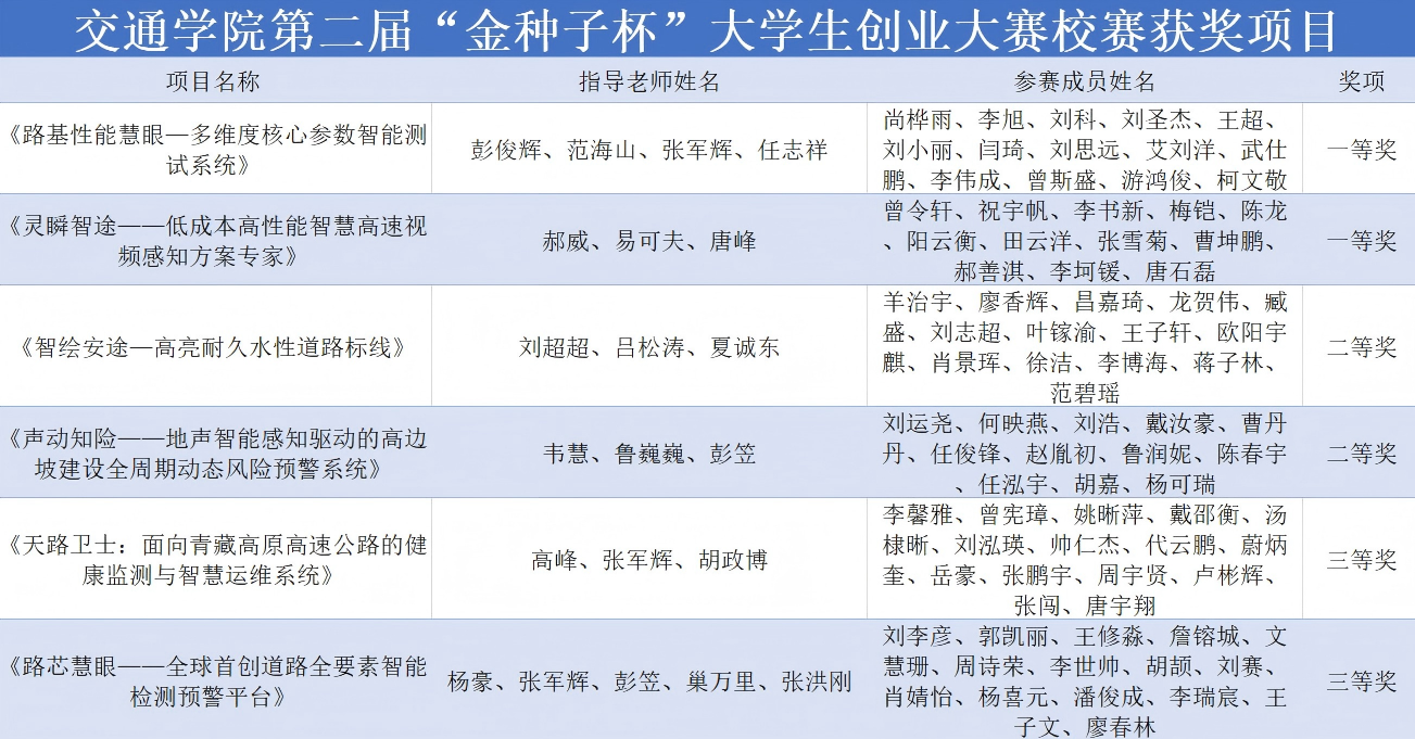 本届大赛以“青春‘湘’聚,竞创未来”为主题,共设先进制造与高端装备、人工智能与信息技术等六个主赛道,并增设“揭榜挂帅”专项赛道。赛事致力于为大学生搭建创新创业成果的展示与交流平台,激发青年学子的创新潜能与创业热情,助力培养适应国家发展需求的高水平创新型人才。我院六个项目在此次比赛中取得了一等奖两项、二等奖两项、三等奖两项的佳绩。其中被评为一等奖的两个项目在比赛中脱颖而出:“路基性能慧眼——多维度核心参数智能测试装备”通过引入中子散射法和静压贯入试验,实现了含水率和压实度的快速获取,并结合数据驱动的路基参数智能反演算法,解决了路基性能参数测不准的难题;“灵瞬智途——低成本高性能高速视频感知方案”聚焦“人工智能+交通运输”主题,针对雷达检测成本高、人工巡检效率低及事件感知滞后等痛点,系统融合多源视频解析、高精度轨迹数据与轨迹大模型,通过时空学习与语义推理,实现交通状态量化评估与异常事件精准识别,构建低成本、高精度、低延时的智能交通系统。