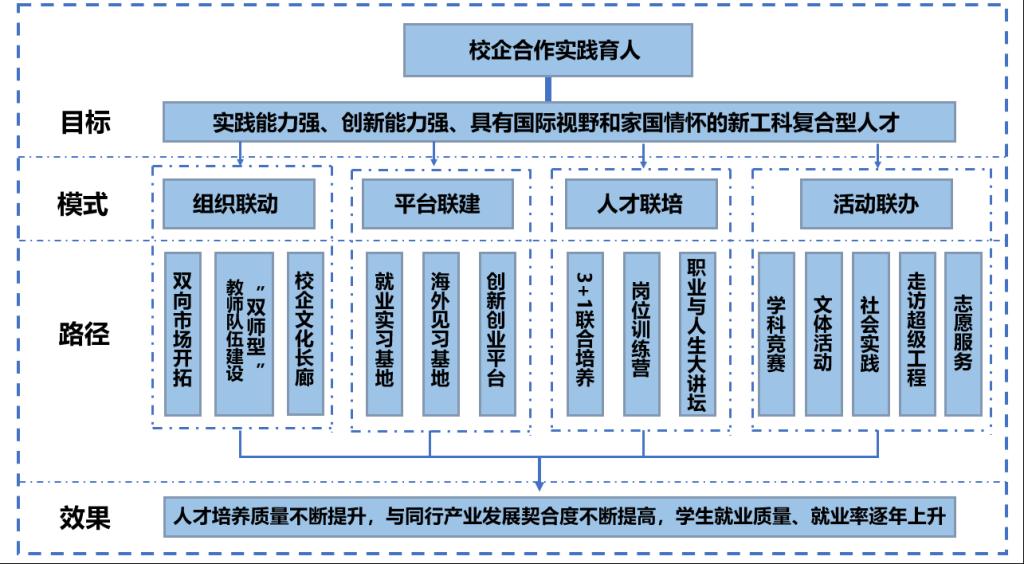 立足学院人才培养模式、教育教学模式和管理模式上的改革实践,全面梳理学院解决教学问题的路径举措,总结凝练形成“组织联动、人才联培、活动联办、平台联建”的“四联共建”校企合作实践育人模式。