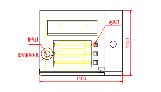 测试装置外部结构尺寸为:宽×深×高(W1400×H1100×D2000);内反应室尺寸为:宽×深×高(W900×H600×D800),标称内容积为:360L。