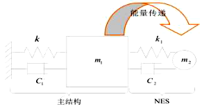 在机械系统中,振动能量在不同的非线性模态间传递是广泛存在的现象。非线性耦合关系使得振动能量可以在具有不同频率的非线性模态之间传递,由于非线性系统中可以发生主共振、超谐振和次谐振,所以即使当两个不同非线性模态间的模态频率差别很大时,能量传递同样可以产生[17],该成果已研制成单自由度非线性动力吸振器(工作原理如图2所示)应用于结构工程及航空航天领域的减振系统。