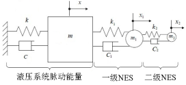我们设想,根据液压系统压力脉动的“时间-频率-能量谱”物理特性,仿照NES的工作原理,设计一种特殊结构的两自由度非线性谐振系统,优化其立方刚度、阻尼及质量系统匹配,在液压流场中自适应实现广谱频率范围内脉动及冲击能量的耗散,达到完美的液压振动广谱滤波消声效果。