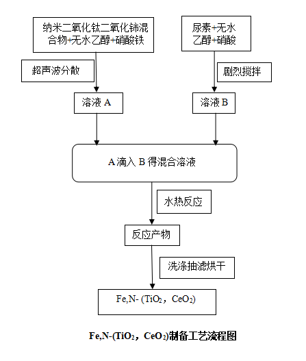 1、将硝酸铁作为Fe源,尿素作为N源,与TiO2和CeO2粉体通过水热合成法合成Fe,N-(TiO2,CeO2)纳米粉体,找出最优的设计工艺与合成实验方案。
