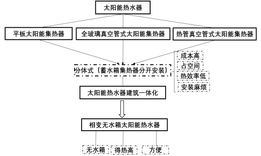 太阳能热水器一般是由集热器、保温水箱、连接管路、阀门、辅助加热器以及控制单元等主要部件组成。保温水箱是用于存储白天集热装置加热的水,以满足客户在需要的时候使用。传统太阳能热水器的使用寿命极大的受到单根真空管影响;热水器在工作时,水箱里面的水与所有的真空集热管联通,只要其中任一根真空管破裂,那么整个热水器将无法使用,而且水箱中的水会完全漏出。传统太阳能热水器无法与现代城市建筑结合,实现热水器与建筑一体化;保温水箱是太阳能热水器的重要组成部分,由于水箱的存在,热水系统的安装极大的受到周围环境限制,故无法实现太阳能热水器与建筑的完美结合。传统太阳能热水器无法与现代城市建筑协调统一也是造成太阳能热水器一直未能在城市中广泛使用的主要原因。传统太阳能热水器管内存水过多,管内水温上升缓慢;由于真空管内部空间比较大,系统中水流的循环流动完全是靠各部位温度不同而形成的自然循环,所以一般的热水装置管中热水无法完全取出,致使系统热水利用效率低。此外,传统的太阳能热水器还存在支架承压大、管子易炸裂、在严寒地区使用易结冻等缺点。