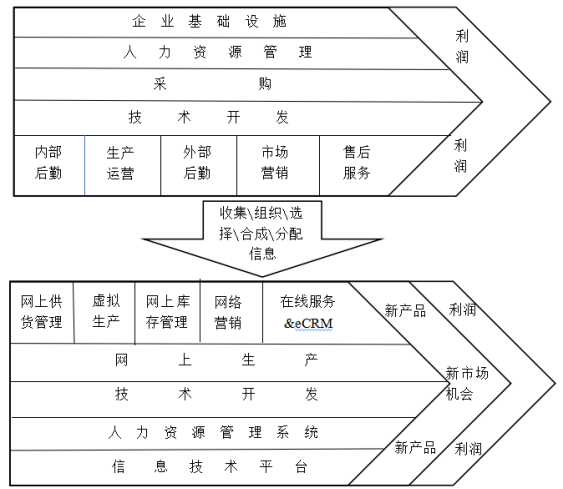 企业在运转过程中通过一系列活动创造价值,其价值创造活动可分为以生产销售活动为中心的基础性活动和企业基础管理活动为支撑的辅助性活动,两者结合在一起形成价值链。电子商务企业与传统企业价值链最大的特点就是添加了虚拟化,主要体现在基础活动上,其价值创造由物质流转变为信息流,其转变过程如下图1所示。