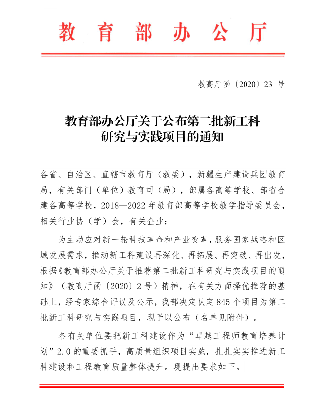 近日,教育部办公厅公布了第二批新工科研究与实践项目名单,云顶国际vip88662个项目获批新工科研究与实践项目,分别是郑健龙院士主持的《交通强国背景下公路交通类专业改造升级策略探索与实践》和胡林教授、杜荣华教授主持的《四化牵引产业驱动的地方高校汽车类专业改造升级路径探索与实践》。同时,云顶国际vip8866获批主持2020年湖南省新工科研究与实践项目3项,参与立项1项。