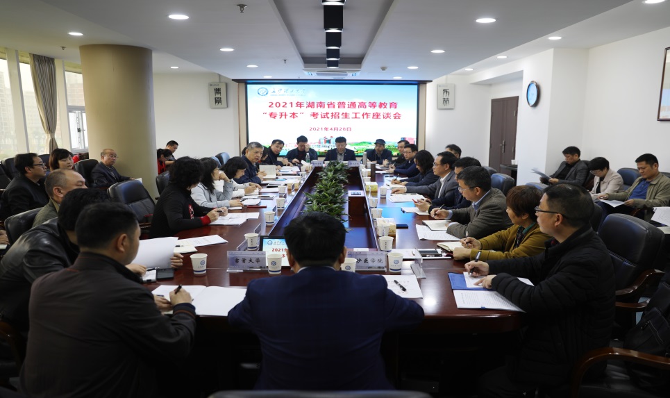 4月28日,湖南省普通高等教育“专升本”考试招生工作座谈会在云顶国际vip8866召开。湖南省教育厅党组成员工委委员左清、省教育厅高教处处长曾力勤、省教育厅高教处副处长周军、省教育厅二级调研员张琳及湖南省20所院校分管领导及教务处负责人参加会议。