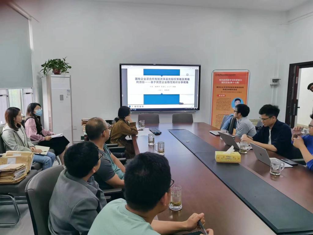 赖烽辉博士的研究方向为公司金融、并购重组和国企改革,在创新激励机制和企业交叉持股等领域取得一些研究成果,曾以第一作者在《经济研究》、Economics Letters等期刊发表论文。首先,赖博士从理论研究的角度深入浅出的介绍了国企混改背景下最优股权策略产生的条件,研究表明激励民营企业分享隐性知识需使其参股比例高于一定阈值;恰好激励隐性知识分享的参股比例为混改的最优股权结构,当且仅当国有企业对隐性知识吸收能力高于特定阈值时,混改才能提升社会福利。随后,赖烽辉博士对与会的各位老师提出的疑问进行了详细的解答,同时分享了研究选题、论文发表的经验。