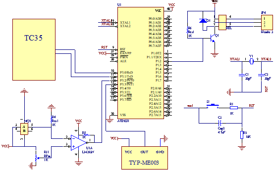 在TC35中装入手机SIM卡,开启电源,放在室内。离开后,用户通过拨打装入的SIM卡号码将报警器开启,防火防盗功能开启后将自动发送短信提示用户已开启。报警状态下,单片机开启两个外部中断,扫描烟雾传感器MQ2和人体红外感应TYP—ME003的信息。当有人在室内非法活动时,人体红外感应捕捉到信息后给单片机发送中断信号,单片机响应中断向TC35发出指令通过其向用户手机发送报警短信,未防止用户在吵闹环境中没注意到报警短信,会打电话进行提示并自动重播直到用户接通电话。火灾报警通过MQ2采集烟雾浓度信号,当烟雾超标时也会以同样的方式发送火灾警报。进入室内前亦可以通过打电话的方式解除警报。同时本作品还有远程控制功能,发送短信可以进行继电器的开合,并通过短信查询报警器和继电器的工作状态。