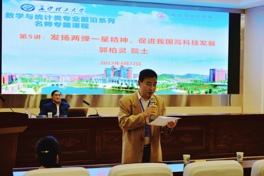 4月22日下午,数统学院开展“数学与统计类专业前沿系列名师专题课程”第5讲——“发扬‘两弹一星’精神,促进我国高科技发展”,中国科学院郭柏灵院士为我院师生讲了一堂十分精彩的课。讲座由数统学院院长张宏伟教授主持,李姣、刘斯丽等200余名师生参加了此次讲座。