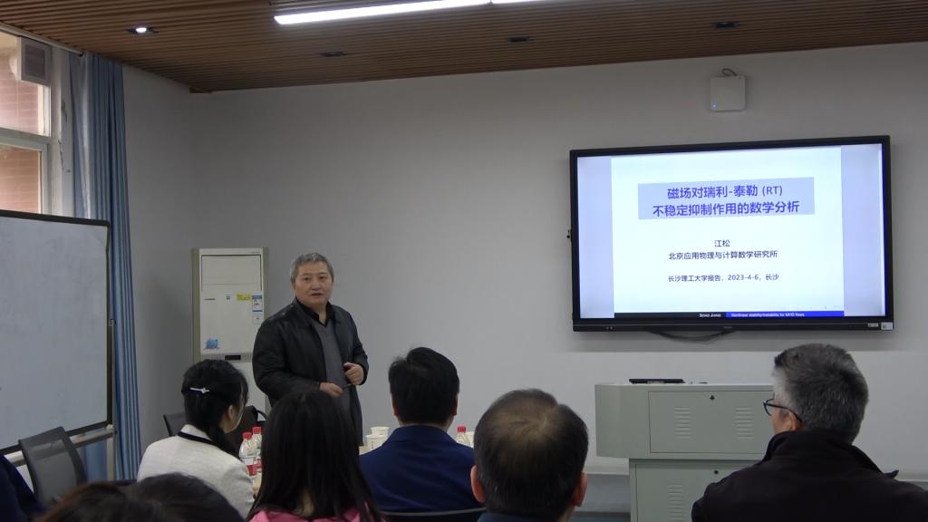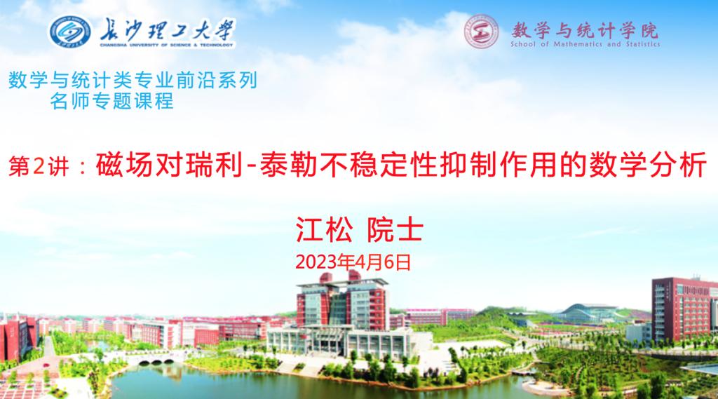 4月6日上午,数统学院开展“数学与统计类专业前沿系列名师专题课程”第二讲,特邀嘉宾是中国科学院江松院士,主题为“磁场对瑞利-泰勒不稳定性抑制作用的数学分析”。讲座由云顶国际vip8866副校长黄创霞教授主持。
