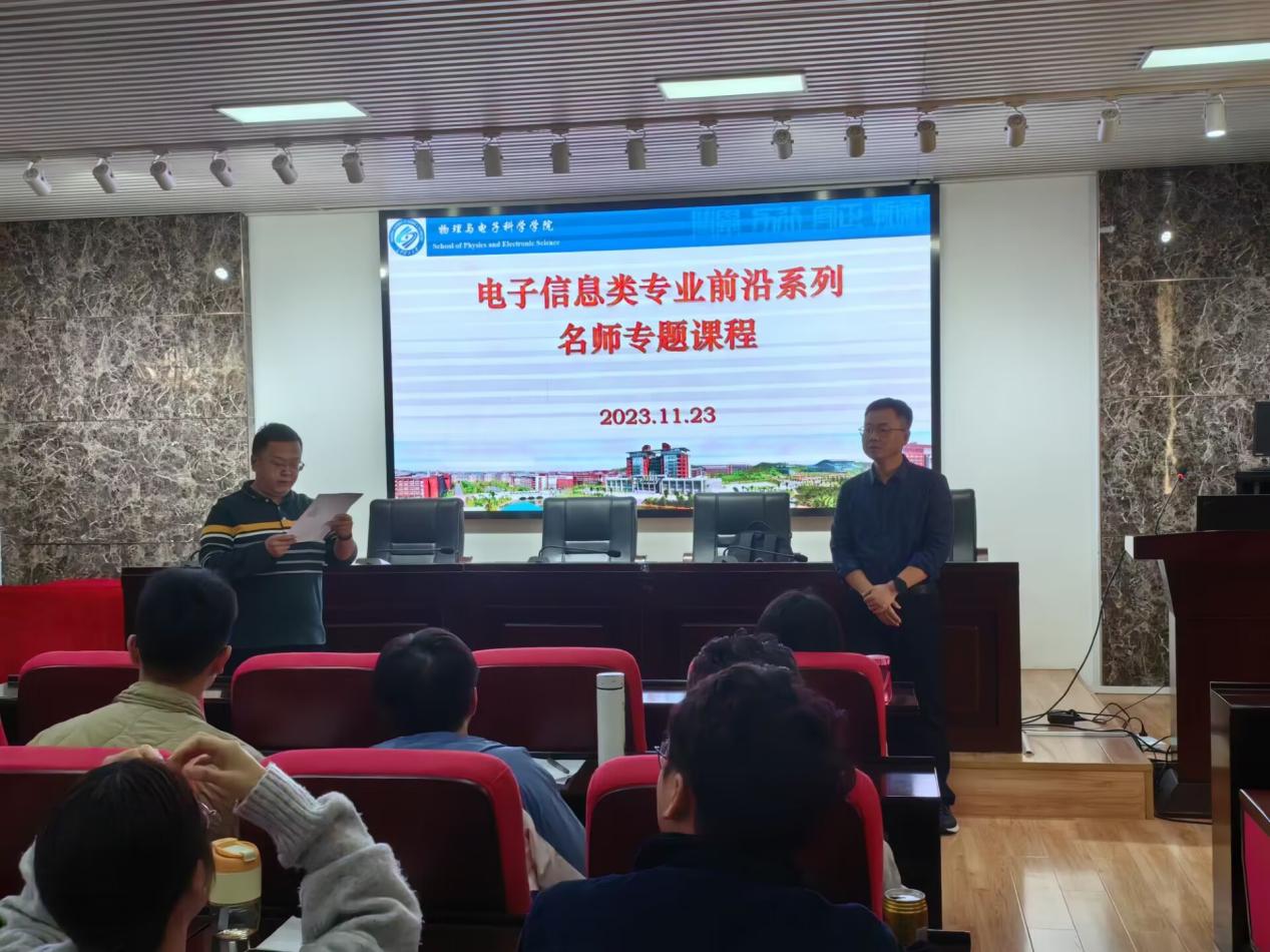 11月23日下午2:30,集美大学计算机工程学院茅剑教授应邀作为我院电子信息类专业前沿系列名师专题课的主讲人,助力学术型人才培养。茅教授在理科楼B-413为学院电子科学与技术的同学们讲授了一堂以“电磁信息安全”为主题的专题课程。前来聆听课程的师生合计100余人,学院副院长范志强出席并主持会议。