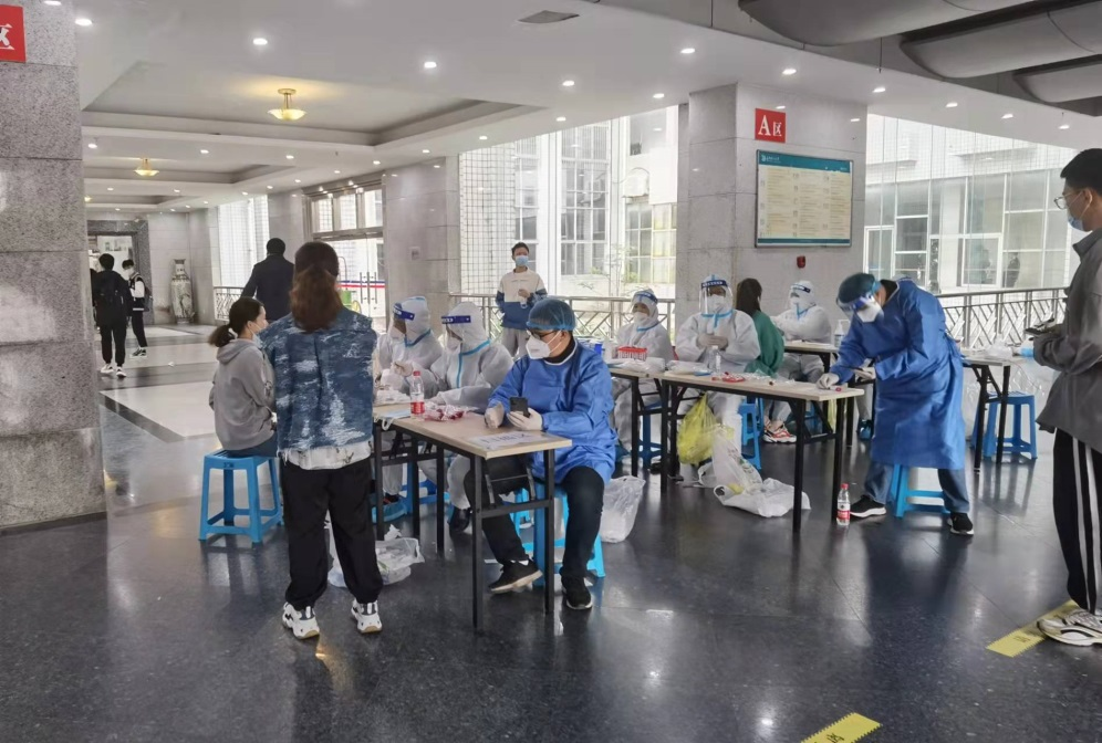为协助学校核酸检测工作,何纯芳书记于3月26日深夜在学院微信群发布了志愿者招募通知,全院党员迅速响应,成立“抗疫先锋队”,并于3月27日清晨准时赶到金盆岭校区体育馆集合,参与学校第三轮核酸检测工作。为了组织好离退休教师的核酸检测工作,学院党员克服大雨带来的不利影响,在检测现场铺设了防滑硬纸板和麻布袋,撑着雨伞搀扶护送每一位参加检测的离退休教师安全离开,保障了检测工作安全、有序的进行。为配合天心区全员核酸检测工作的顺利推进,学院二十几名党员干部和群众自发组成志愿者团队,高效地完成了4月4号与5号学校核酸检测的协助工作。