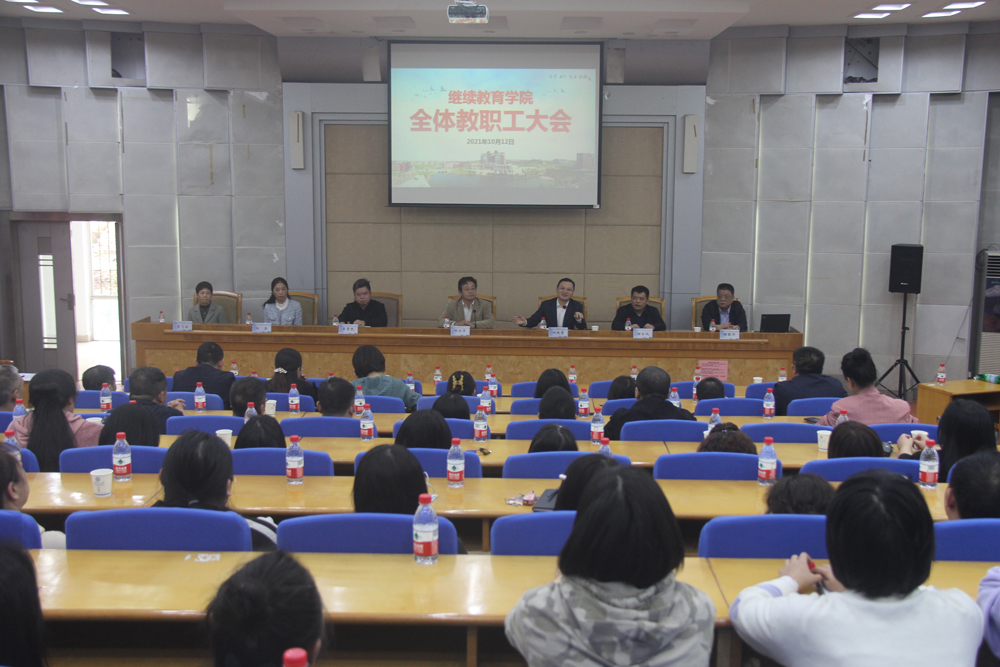 2021年10月12日下午,继教学院在金盆岭校区办公大楼一楼多功能报告厅,召开了学院全体教职员工大会,邹兴平院长以《坚持立德树人,弘扬狼性文化,狠抓作风建设,促进学院高质量发展》为题,对学院进一步加强作风建设的决定进行了宣传讲解。