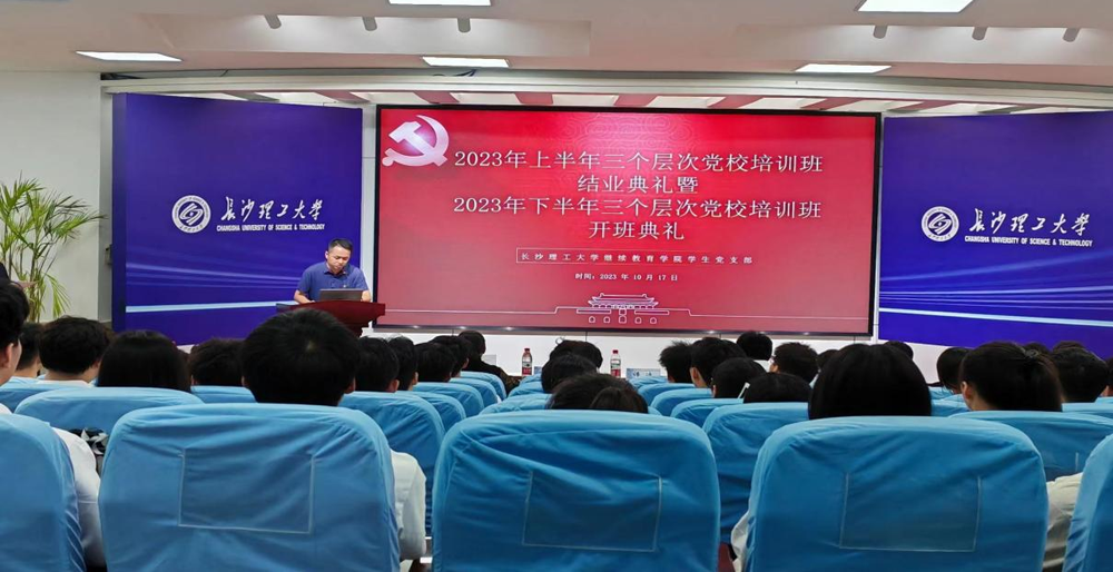 2023年10月17日晚,云顶国际vip8866继续教育学院分党校在12教200教室举行了2023年上半年三个层次培训班的结业典礼及2023年下半年三个层次培训班的开班典礼。学院党总支副书记谢士成、学院党总支组织员周靖、学生党支部书记谭冰、党务老师周记荣、各教学部负责人、学生支部全体党员及全体培训班成员参加典礼。