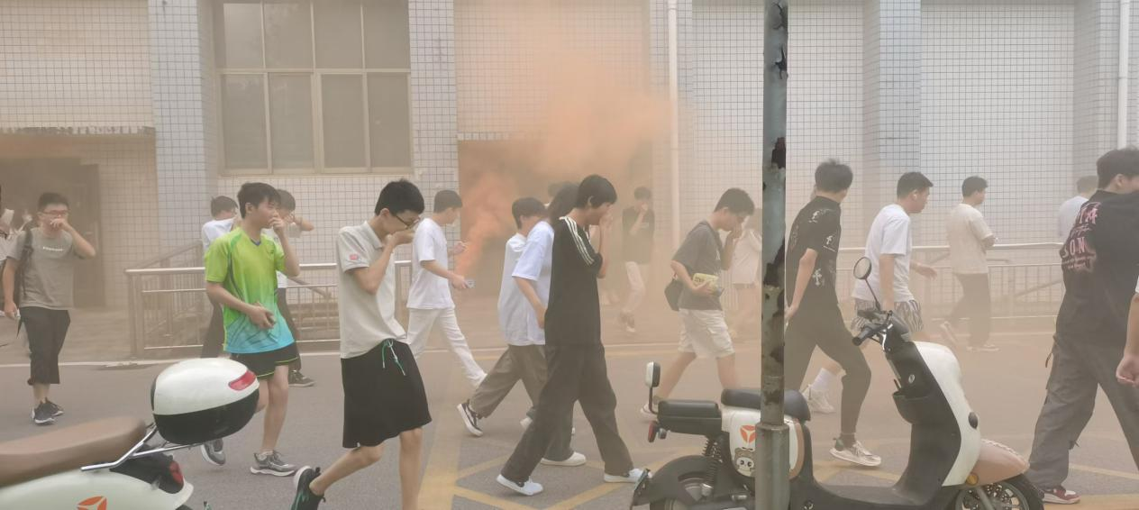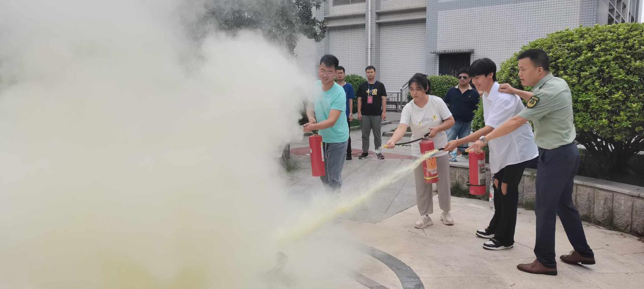 在消防逃生演练过程中,学生按照预先设定的路线迅速有序地从物理实验室撤离至楼外安全区域。随后,曾教官演示了干粉灭火器的使用步骤和注意事项。为了让学生掌握灭火器的使用方法,现场还组织学生进行了体验使用灭火器灭火的活动。