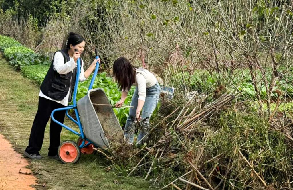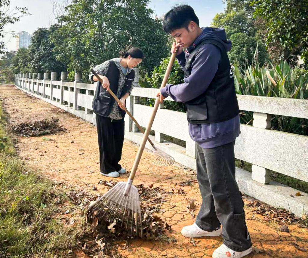同学们分为三个小组对河道旁生长的杂草、农场草坪区域的枯枝败叶和周边的各类垃圾等展开了有序的清理工作。