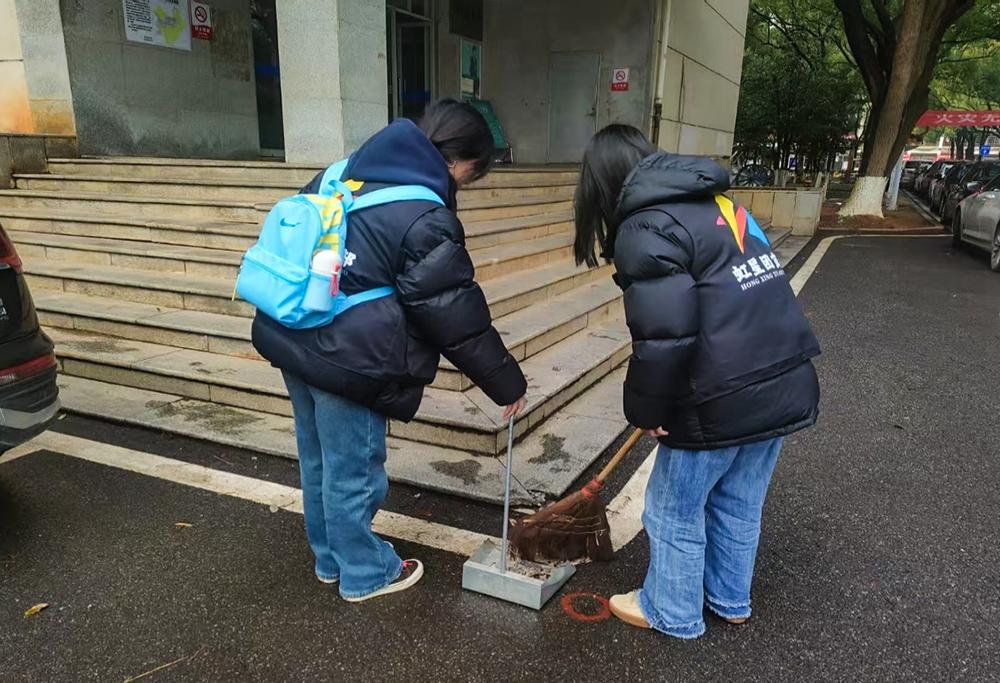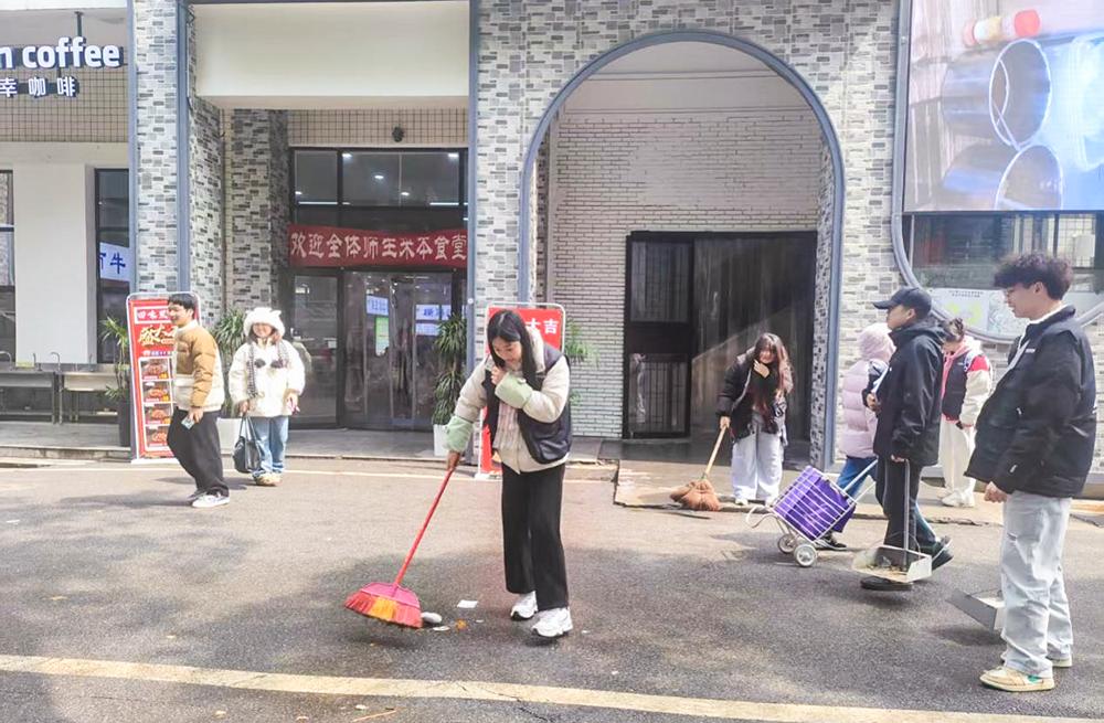 学院团委学生会与学生党支部的同学们精神抖擞,分工明确,各司其职,对金盆岭校区各自负责的卫生区域进行了全方位、无死角的清理。无论是教学楼的走廊、教室,还是校园的花园小径等,都能看到他们忙碌的身影。他们充分发挥党员干部和学生干部先锋模范作用,践行雷锋精神,以身作则,不怕脏、不怕累:清理卫生死角,捡起地上的纸屑、烟蒂,擦拭栏杆、门窗,搬运垃圾,不放过任何一个细微之处。