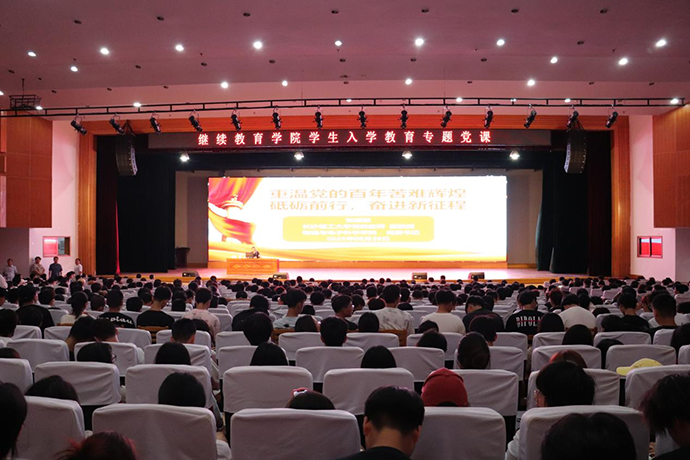 8月28日上午9:00,继续教育学院在五教大礼堂举行学生入学教育专题党课,共同开启新学期首场重要思想引领课程。这场以“重温党的百年苦难辉煌 砥砺前行,奋进新征程”为主题的专题党课,为学生扣好了大学生涯的“第一粒思想纽扣”,开启筑梦新征程。
