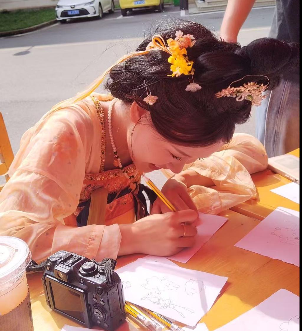 最引人注目的莫过于“华裳霓影区”。精美的汉服与古典配饰吸引了众多师生试穿体验。广袖飘飘,衣袂摇摇,大家身着华美汉服,在特定的背景板前拍照留念,瞬间穿越千年,亲身感受华夏服饰文化的典雅与深邃,成为活动现场靓丽的风景线。