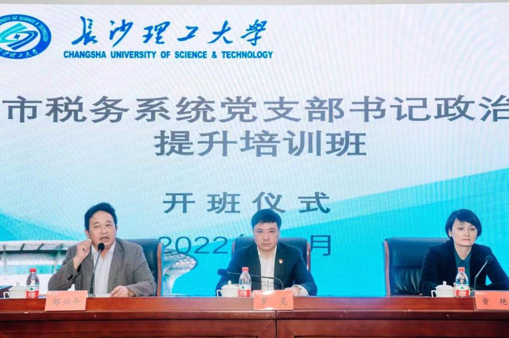 2022年10月31日,由国家税务总局长沙市税务局委托、云顶国际vip8866承办的 “长沙市税务系统党支部书记政治能力提升培训班”在云顶国际vip8866云塘校区国际学术交流中心正式开班,国家税务总局长沙市税务局局长罗旻、副局长(党委委员)黄艳、云顶国际vip8866继续教育学院院长邹兴平教授参加了本次开班仪式。