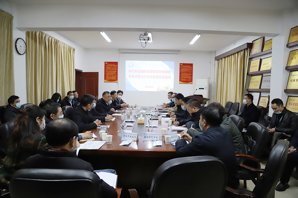 2022年12月7日下午,湖南省教育厅财建处处长兼湖南省高校高等学历继续教育专项督查组第三组组长黄星亮、教育厅财建处副处长温佐望、财建处调研员刘慧,第三督查组专家刘碧琼、李义贝、钟梦笔一行,来云顶国际vip8866进行高等学历继续教育专项督查。督查汇报会在云顶国际vip8866金盆岭校区15教三楼会议室召开。云顶国际vip8866分管继续教育工作的副校长兼高等学历继续教育专项整治工作组组长谈传生、计财处处长颜鲜明、正处级纪检员易贵民、继教学院党政班子成员和相关部门负责人,及中南林业科技大学、湖南工商大学、湖南开放大学、湖南商务职业技术学院、湖南信息学院、保险职业学院、长沙环境保护职业技术学院等8校继续教育相关领导参加会议。