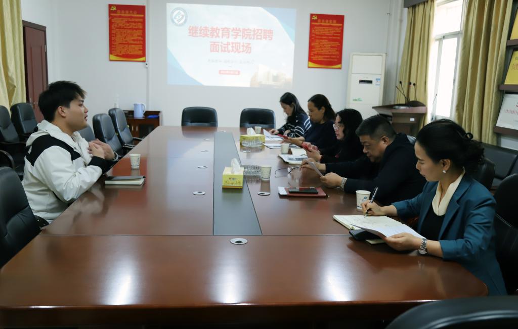 2023年3月13日下午,继教学院在15教三楼会议室举行了学院业务等部门工作人员招聘会。招聘会由继教学院副院长谢朝华主持,学院党政办公室、成教部、自考一部、自考二部、学工部、后勤部等有关部门负责人参加。