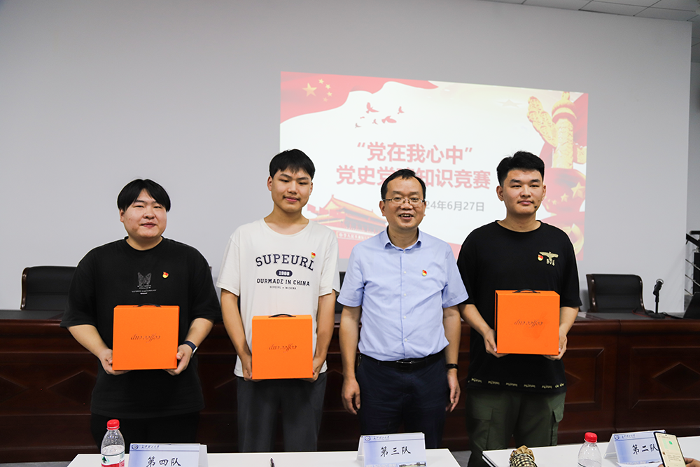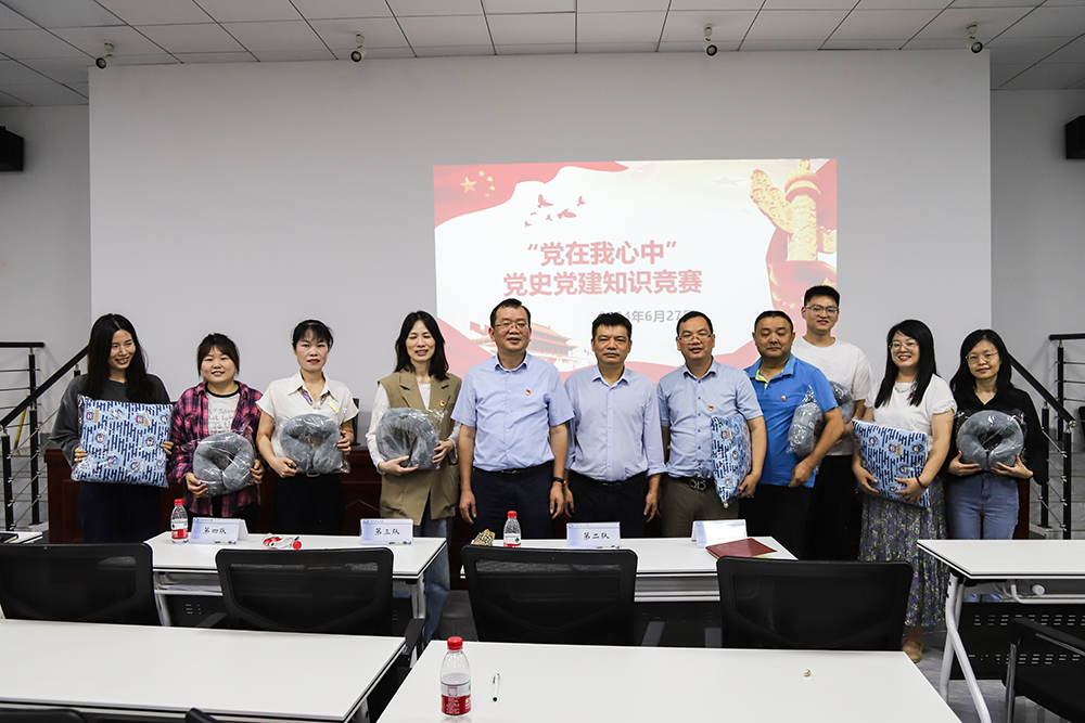 主题党日活动的第二项,进行由各党支部精心策划、认真准备,组织员周靖主持的“党在我心中”党史党建知识竞赛。经过必答题、抢答题、风险题三个环节的激烈角逐,学生党支部最终获得一等奖,其他三个支部获得二等奖。比赛结束后由党委书记刘思强、党委副书记谢士成给参赛队员颁奖。