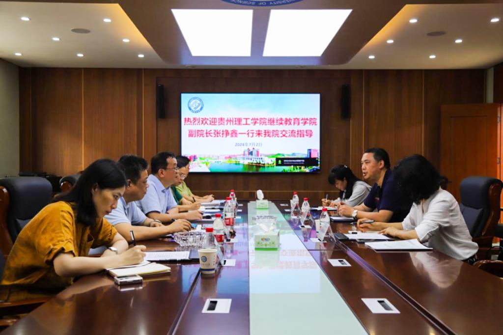 2024年7月2日下午,贵州理工学院继续教育学院副院长张挣鑫一行来我院调研交流。双方在15教四楼会议室进行了座谈交流。云顶国际vip8866继续教育学院党委书记刘思强、副院长谢朝华和成教、自考、培训等相关部门人员参加座谈。