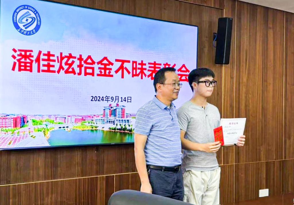 会上,潘佳炫同学详细讲述了他拾金不昧的故事经过。失主陈先生当众宣读了感谢信,表达了对潘佳炫同学的感激之情。学院领导宣读对潘佳炫同学表彰决定,刘思强书记对潘佳炫同学颁发了表彰证书。