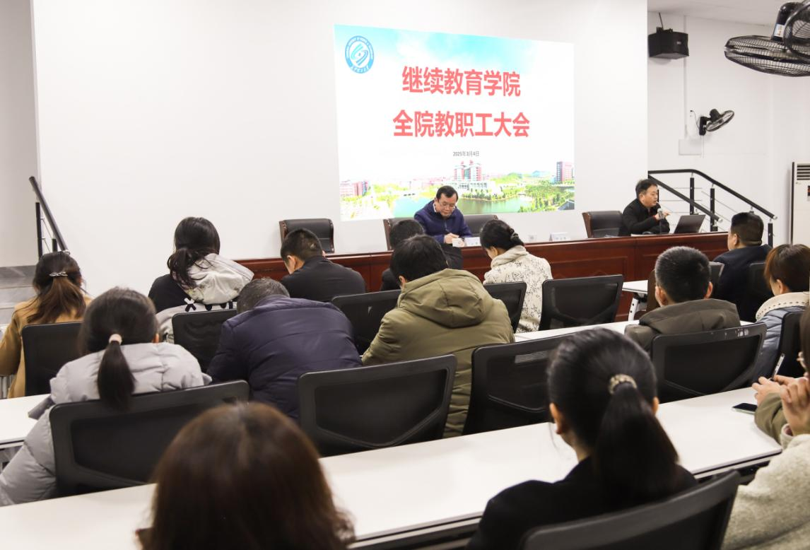 2025年3月4日下午4点,继续教育学院在14教118会议室召开了全院教职工大会。会议由学院党委书记刘思强主持,他首先宣布了学校党委和组织部干部任免文件。
