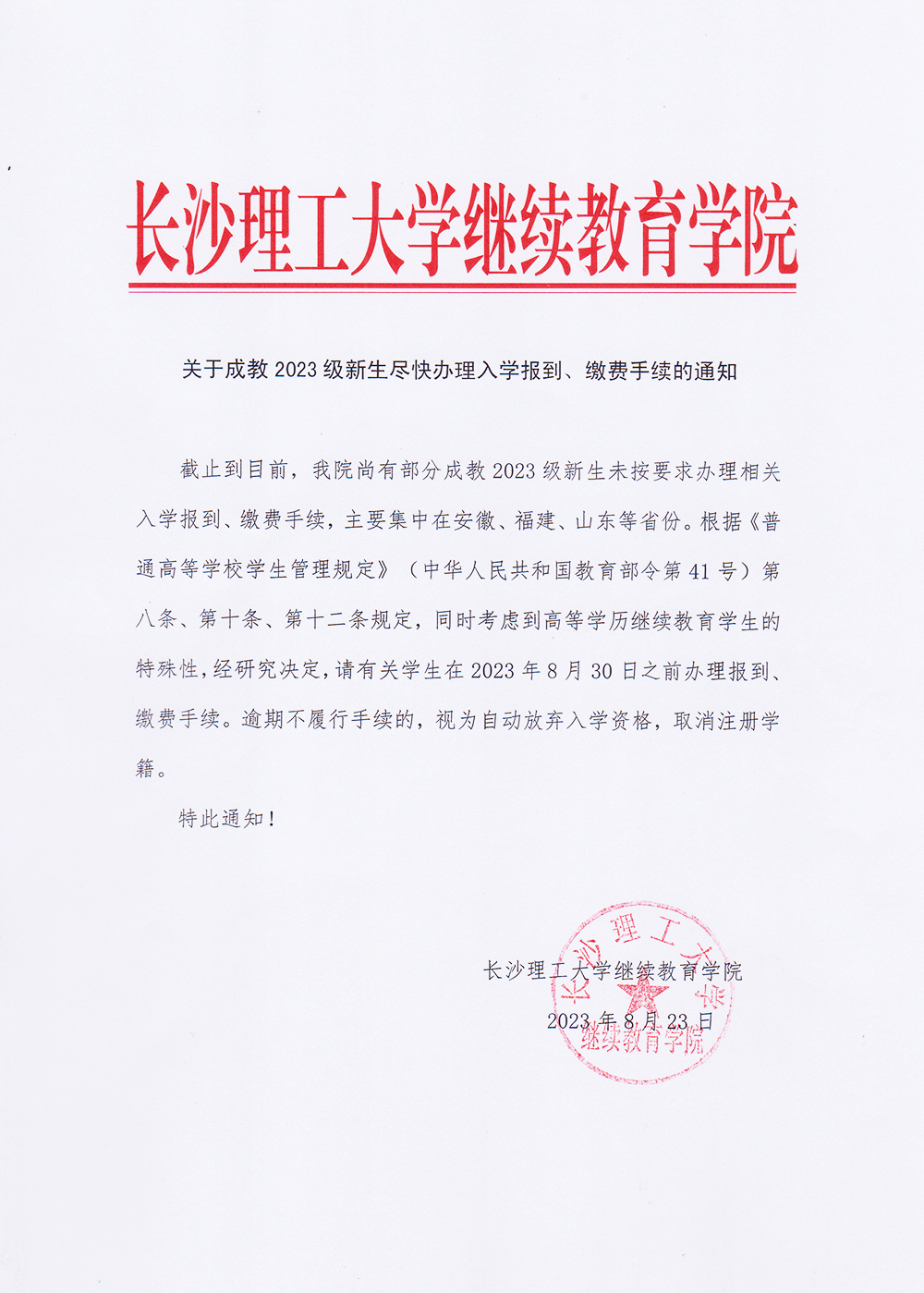 关于成教2023级新生尽快办理入学报到、缴费手续的通知