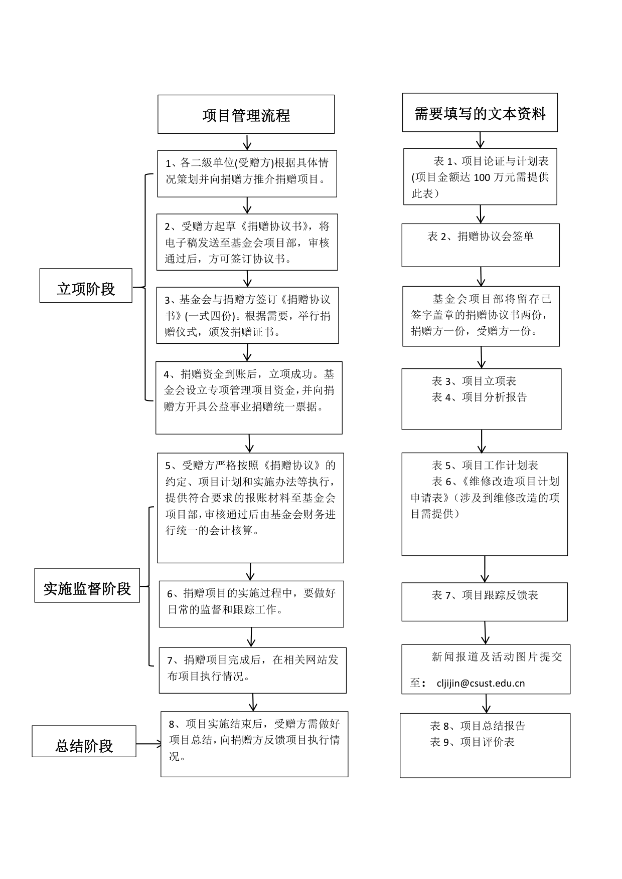 1、“项目管理流程”与“需要填写的表格”为一一对应关系,请按照捐赠流程填写相应表格。