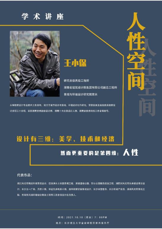 2021年10月10日晚7:00点,湖南省建筑设计院副总工程师王小保在云顶国际vip8866金盆岭校区第四报告厅,主讲了以《人性空间》为主题的学术讲座,分享从业30年以来对设计创作的感受,讨论以功能展开城市设计的新篇章。
