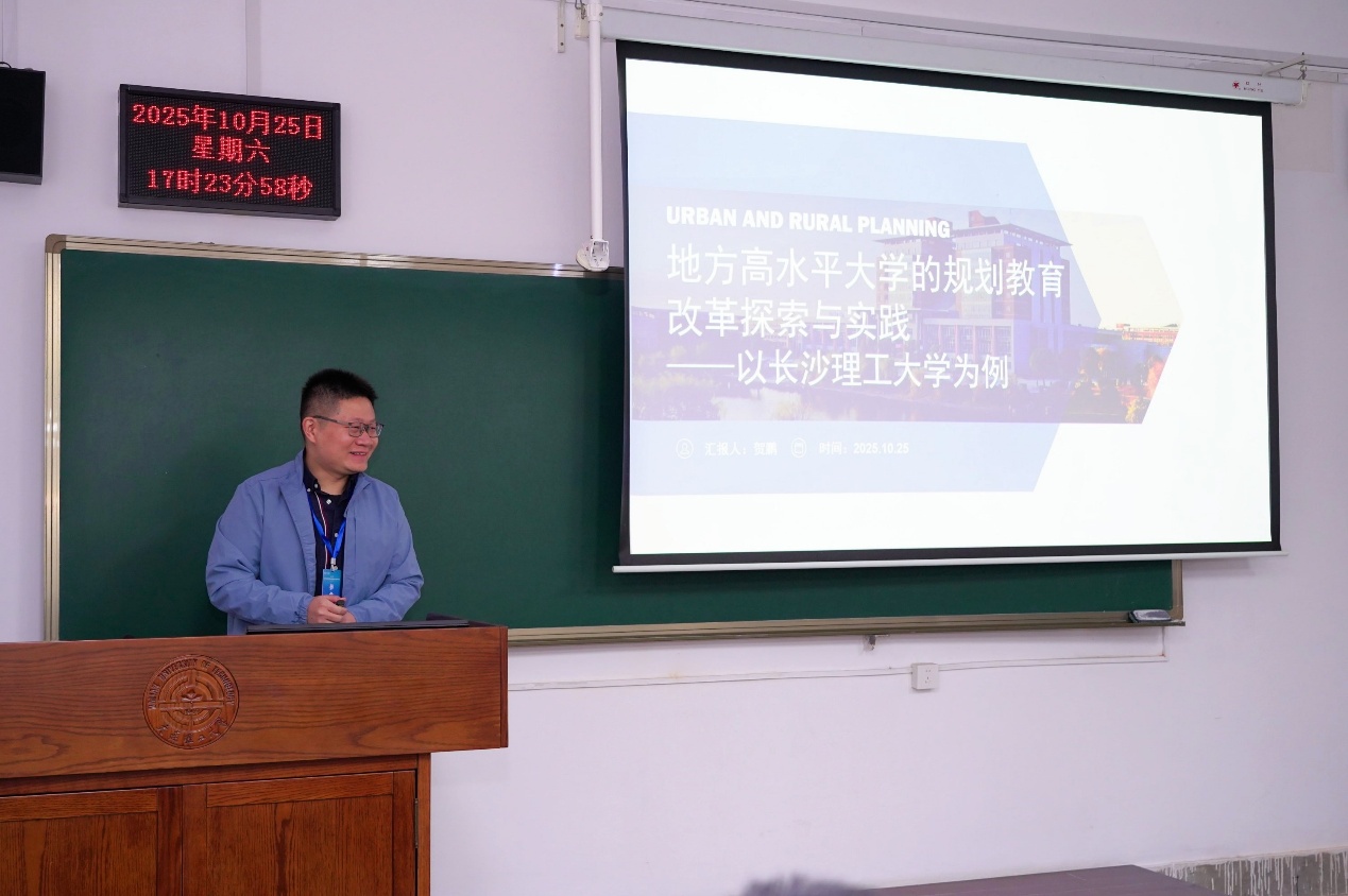 下半场,各高校青年骨干教师分三个会场进行圆桌研讨会。我院城乡规划系贺鹏老师在第二分会场作专题报告。报告从湖湘地域文化特色、强化行业基因、打造需求导向和培养特质人才四个方面介绍了学校近年来的发展成就以及城乡规划专业面对行业形势采取的具体应对举措和改革策略,展现了“政产学研用”在湖南的生动实践。最后,贺鹏老师进一步呼吁,行业主管部门应关注地方高校的学科建设工作,加大政策倾斜与资源支持力度,多方协同发力,共同为“现代化人民城市”目标下的规划人才培养事业贡献力量。