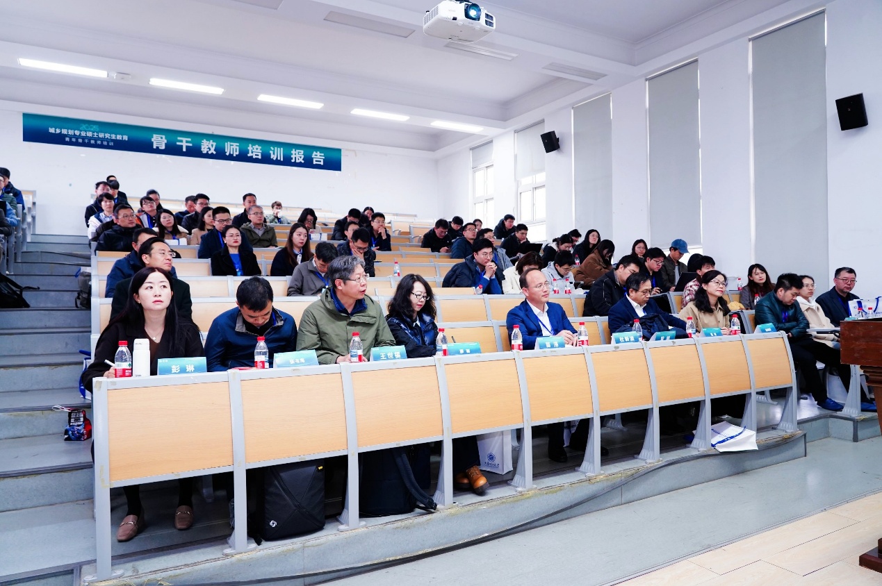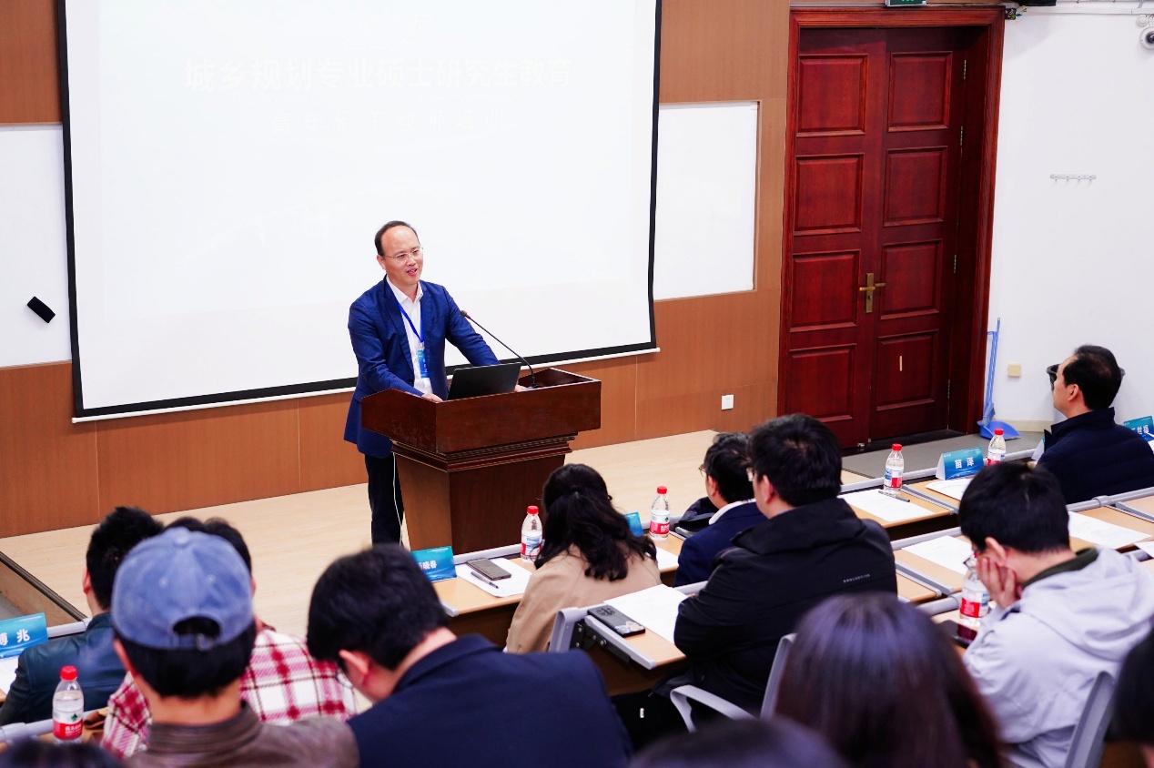 培训分为上下两个半场,上半场由自然资源部国土空间规划局副局长苗泽、自然资源部人力资源开发中心副主任杜新波分别致辞并传达了自然资源部对于城乡规划专业人才培养的政策和具体举措,自然资源部国土空间规划研究中心副总规划师廖蓉、国务院学位委员会城乡规划学学科评议组成员王世福、城乡规划专业学位研究生教育指导委员会副主任委员曾鹏分别作关于规划学科发展转型思考相关的主旨报告。