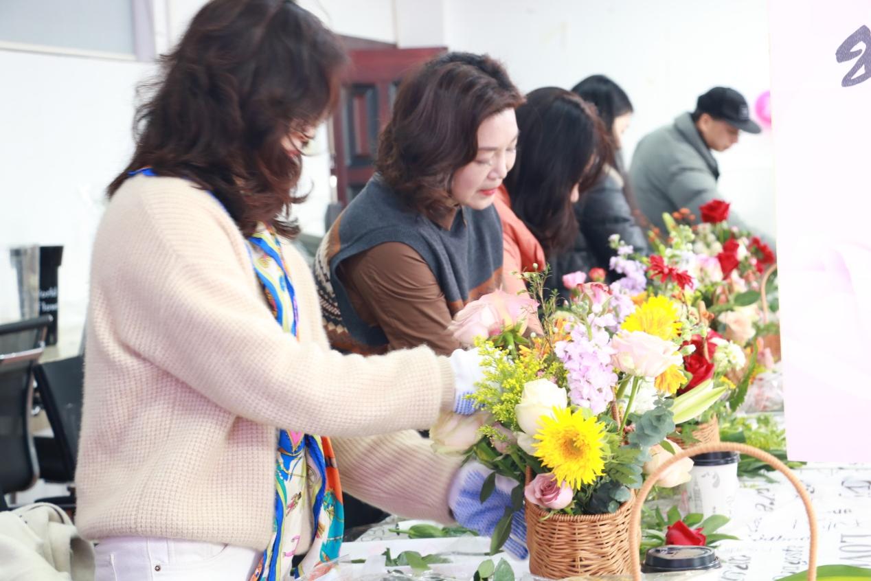 活动现场以粉色调为主,精心布置了每个角落,桌上摆满了玫瑰、向日葵、康乃馨等各类鲜花,色彩缤纷、香气扑鼻。活动伊始,学院党委副书记肖义慧主持,为活动暖心开场。随后,学院党委书记熊鹰致辞,向全院女教职工致以节日的问候,对她们在教学、科研、学院发展等各方面的辛勤付出表达了诚挚感谢。接着,校工会朗诵协会会长李慧老师带领学院老师朗诵《柔和的力量》,“女性自有力量,温柔可抵风霜......”她们的朗诵情感真挚饱满,如潺潺溪流,淌入老师们的心田,让大家沉浸在女性力量的诗意世界里。最后,专业花艺老师陈娟教授指导老师们插花。她细致讲解插花技巧,从花材的挑选、修剪,到色彩搭配、造型设计,一步步演示,让大家迅速掌握插花要领。女教职工们兴致勃勃,纷纷动手实践。她们相互交流、探讨创意,精心搭配每一朵花,力求让作品完美。在花香四溢,欢声笑语的氛围里,一件件独具匠心的插花作品诞生,有的简约优雅,有的华丽大气,各具特色。