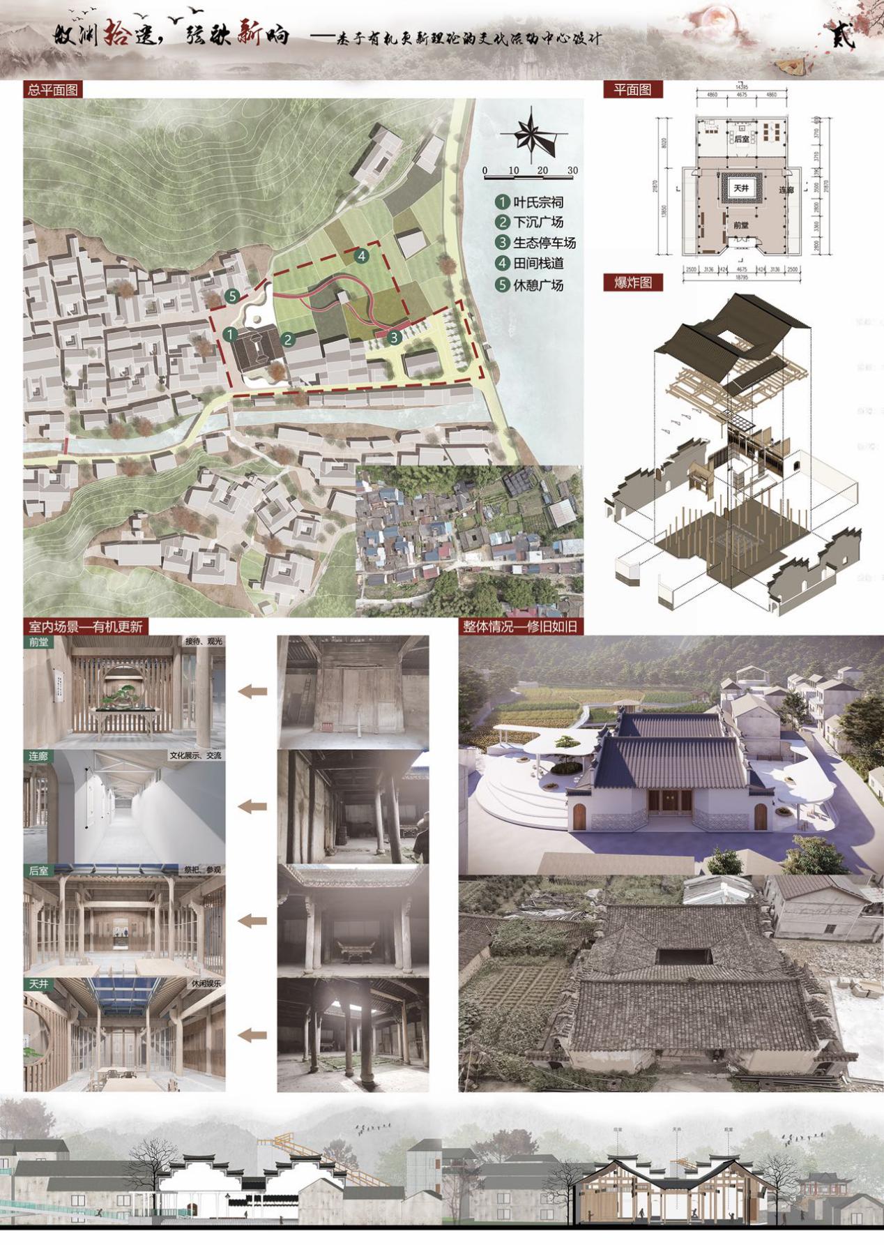 本次乡村设计方案单元共有51个作品进入遴选,经过逆序淘汰、优选投票、排名打分和评议环节,评出各等级奖项,最终结果为:一等奖1个、二等奖2个、三等奖3个、优胜奖3个、佳作奖15个。我院由欧阳国辉、王轶老师指导的孙福鑫、王强、肖文秀、吴旭安、陈鸿杰同学的作品《故渊拾遗,弦歌新响》荣获佳作奖。