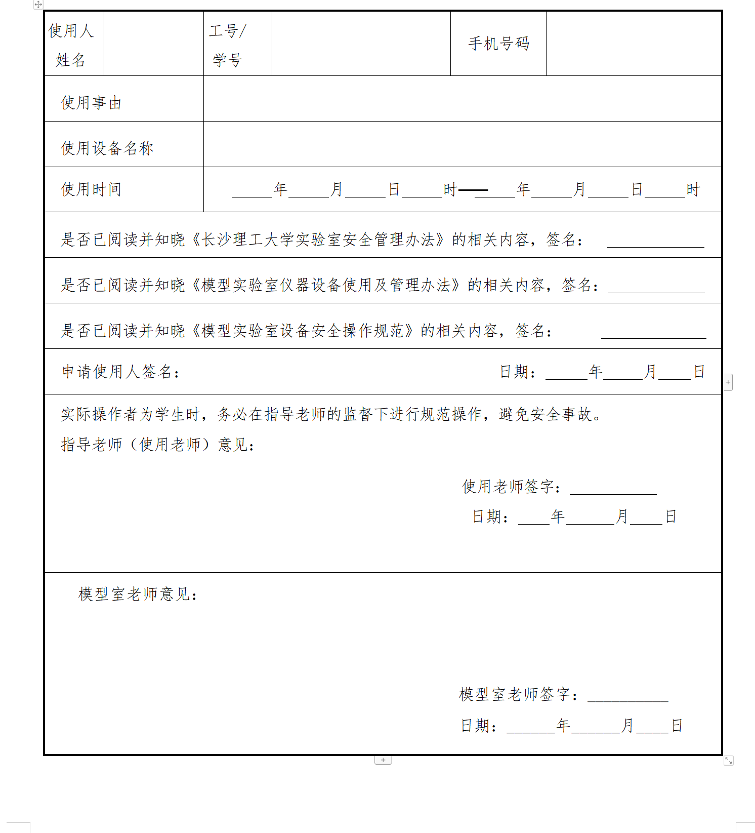 请确认是否已阅读并知晓《云顶国际vip8866实验室安全管理办法》、《云顶国际vip8866建筑学院模型实验室仪器设备使用及管理办法》、《建筑模型实验室设备安全操作规范》的相关内容,按要求填写表格。