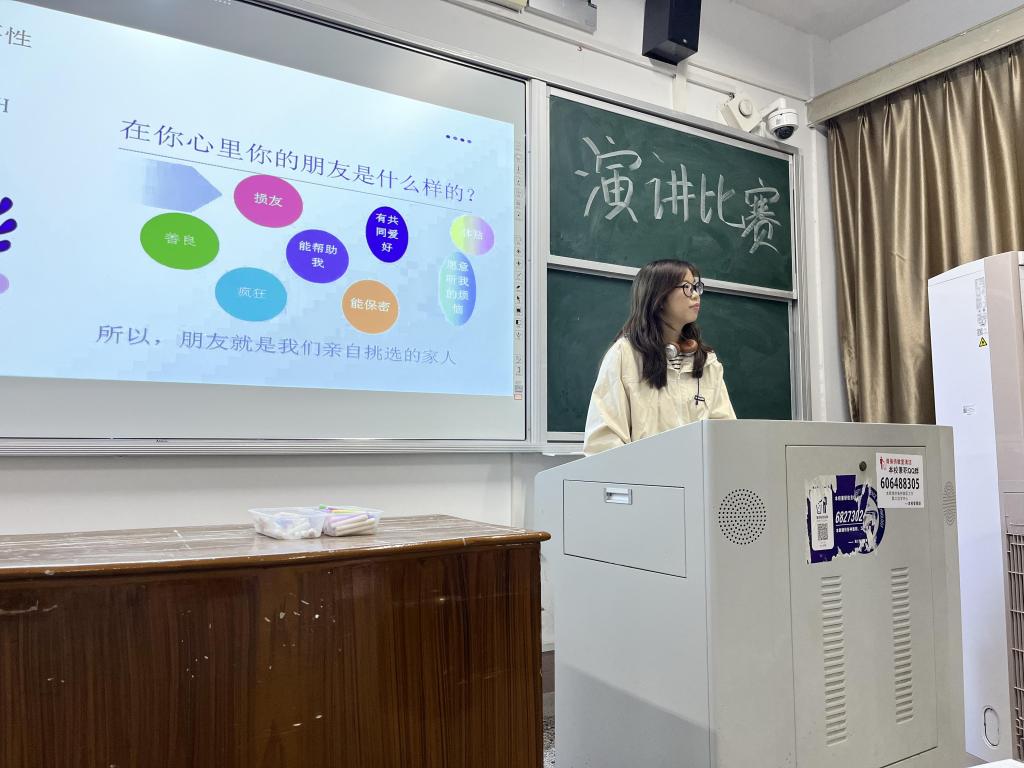 郭子嘉同学以“亲情和暴力不可兼得”为主要切入点,采用第一视角进行论述非暴力沟通的魅力,身临其境,发人深省;王诗雅同学重点论述了在友谊中沟通的技巧,列举数个场景,生动有趣;白诗怡同学通过与观众之间的互动,将与异性相处的技巧娓娓道来,通俗易懂……