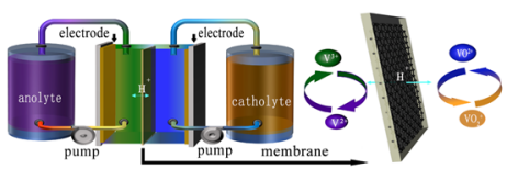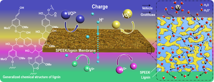 上述隔膜均为Nafion膜改性,仍然依靠进口“卡脖子”材料——Nafion。开发国产膜材料对液流电池产业化发展至关重要。团队丁美教授和贾传坤教授开发一种低成本绿色的磺化聚醚醚酮(SPEEK)/木质素(lignin)复合模,并成功应用到液流电池上。该膜表现出比Nafion优越的离子选择性及显著降低的钒离子渗透。在钒电池中表现出达到99.5 %的库伦效率,经过长时间循环后电池仍保持良好的性能。相关研究结果在材料类著名期刊膜科学上发表(Journal of Membrane Science, 2019, 572, 110–118,SCI一区,ESI 高被引论文)。论文第一作者为云顶国际vip8866与重庆大学联合培养博士生叶家业,云顶国际vip8866丁美教授、贾传坤教授为共同通讯作者。
