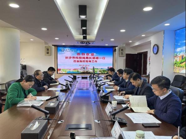 3月6日下午,长沙市科技局党组书记、局长郭塨带领市科技局科技成果与技术市场处、创新发展处相关负责人来云顶国际vip8866调研科技创新工作。校党委委员、副校长钱国平出席会议,科研部门相关人员参加了座谈会,会议由科研部部长王进主持。