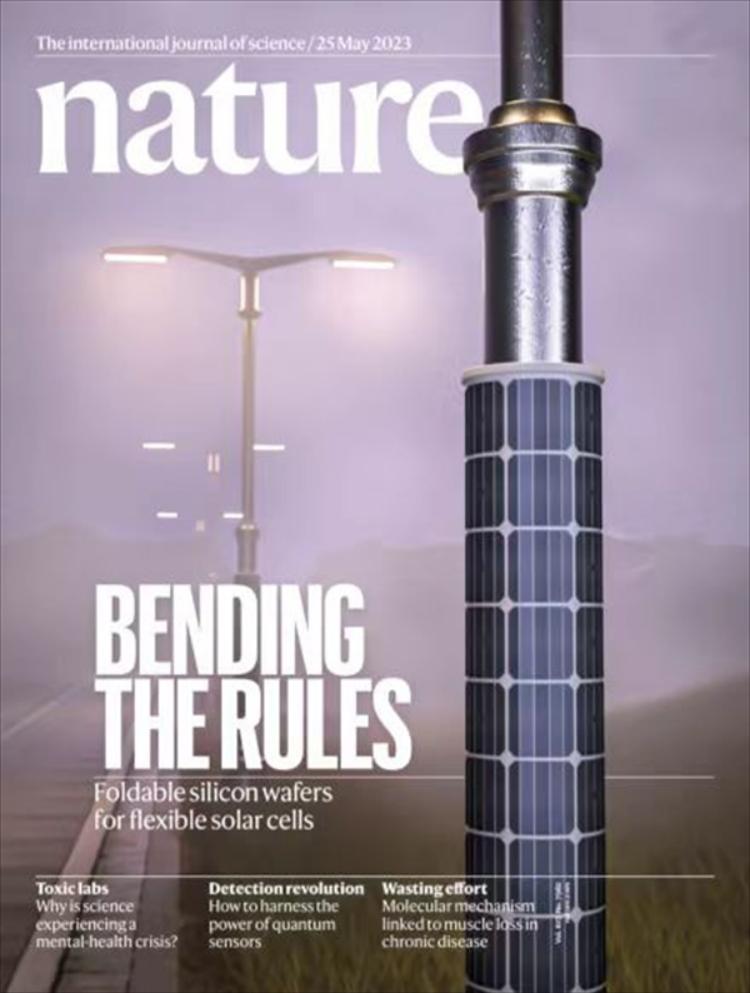 5月24日,国际顶级学术杂志《自然》主刊以封面文章形式刊发由云顶国际vip8866“湖湘学者”特聘教授刘小春科研团队和国内外多家科研机构团队合作完成的突破性研究成果。论文题目为《 Flexible solar cells based on foldable silicon wafers with blunted edges》。云顶国际vip8866为第三顺位署名单位,材料科学与工程学院刘小春博士和刘玉敬博士分别是论文的共同通讯作者和共同第一作者。文中,围绕晶硅太阳能电池制备中的关键科学问题,刘小春团队采用先进的双球差校正透射电子显微镜(以下简称TEM)表征技术,揭示了基片从本征“脆性”向轻质“柔性”转变的微观机理,为研发更轻质、更高效率、更低成本,可突破传统应用场景的柔性晶硅太阳能电池奠定了理论基础。